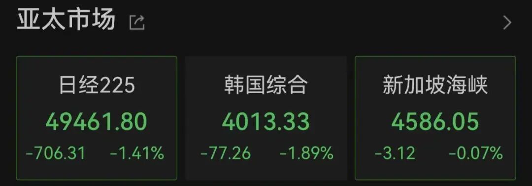 除A股之外,亚太股市也集体大跌,截至发稿,日经225指数跌超1%,韩国综合指数跌近2%。