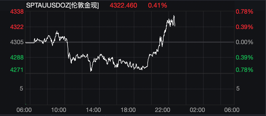 黄金直线拉升。截至发稿,现货黄金报4322美元/盎司,报涨0.41%。