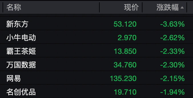 中概股方面,纳斯达克中国金龙指数下跌0.79%。新东方跌超3%,小牛电动、霸王茶姬、网易跌超2%。