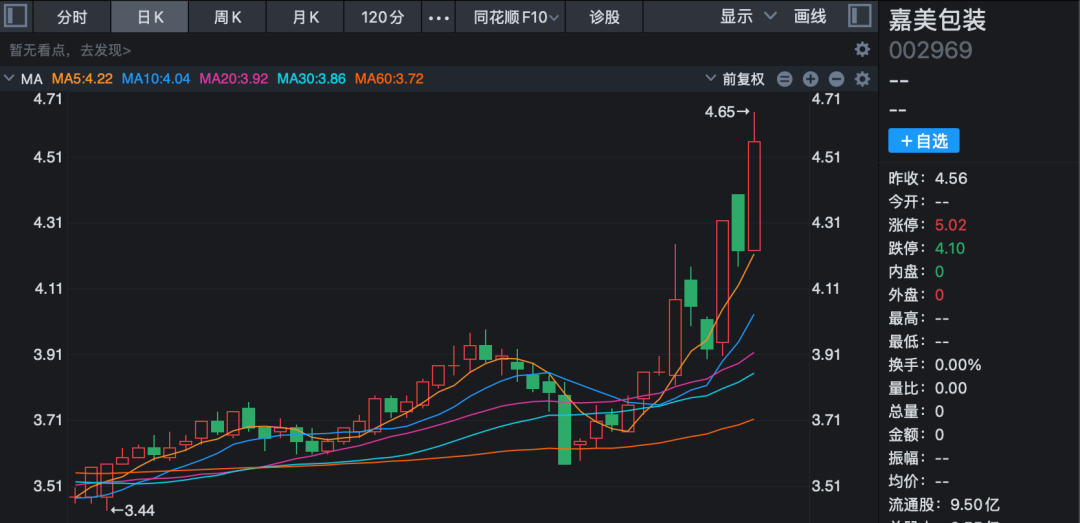 需要关注的是,在宣布筹划控制权变更停牌前,嘉美包装股价已先涨为敬,12月5日—9日累计涨幅超16%,最新报收4.56元/股,创阶段性新高。