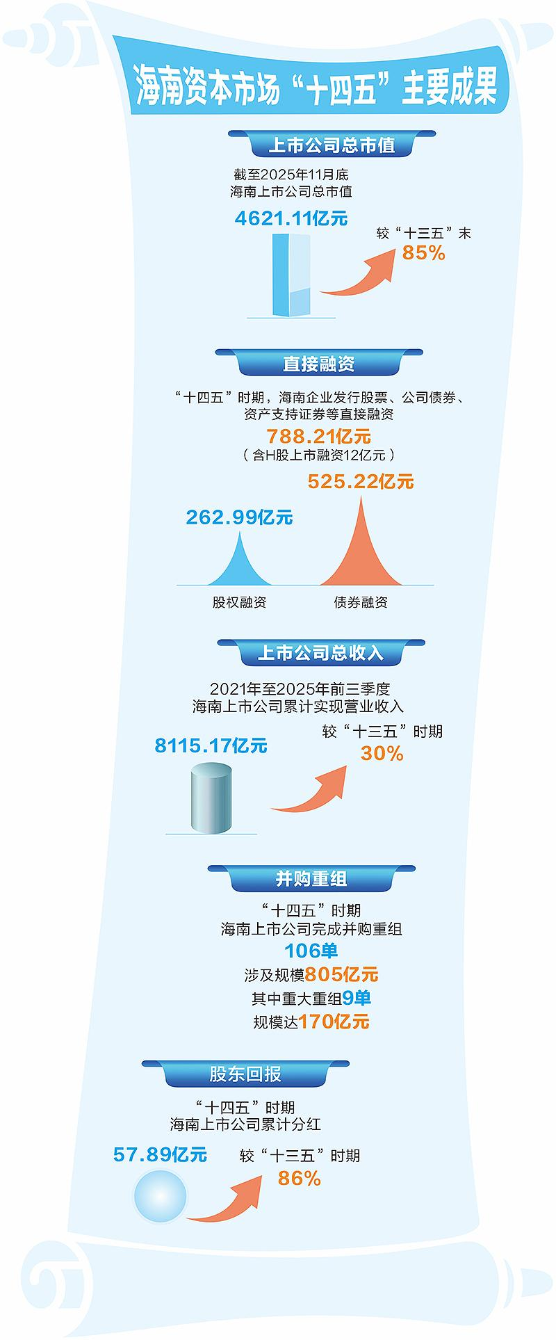 在自贸港政策红利与资本市场改革深化的双重驱动下,海南资本市场交出了一份规模与质量双升的亮眼答卷:五年来累计实现直接融资788.21亿元,上市公司总市值较“十三五”末增长85%,达4621.11亿元,百亿级市值企业扩容至14家,并购重组规模突破800亿元,累计分红同比增长86%。这些实打实的数据,不仅为旅游业、现代服务业、高新技术产业等注入强劲金融动能,更筑牢了自贸港高质量发展的资本根基。