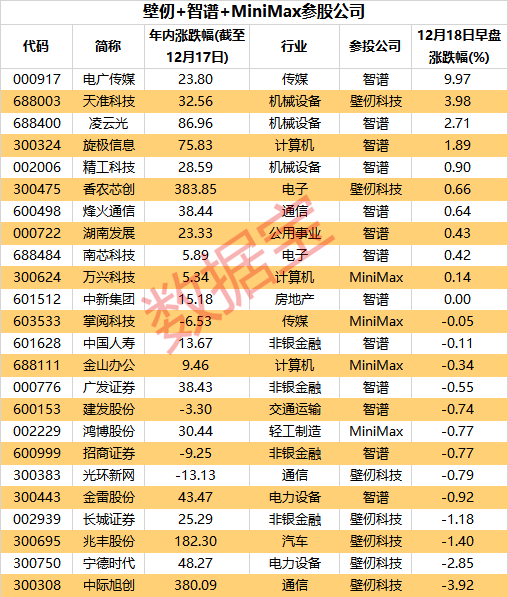 人民财讯12月18日电,近日,“大模型六小龙”(智谱华章、MiniMax、月之暗面、阶跃星辰、百川智能、零一万物)中多家公司的IPO更新进度条。香港联交所披露的资料显示,壁仞科技已正式通过港交所聆讯。据腾讯新闻《一线》从不同信源处获悉,MiniMax和智谱华章本周初均完成证监会备案并通过港交所聆讯,标志着国产大模型迈入资本化关键阶段。从参股公司的市场表现来看,截至12月17日,壁仞科技参股方香农芯创、中际旭创、兆丰股份年内涨幅均超过180%。12月18日早盘,智谱华章参股公司电广传媒封住涨停板,壁仞科技参股公司天准科技涨幅接近4%。