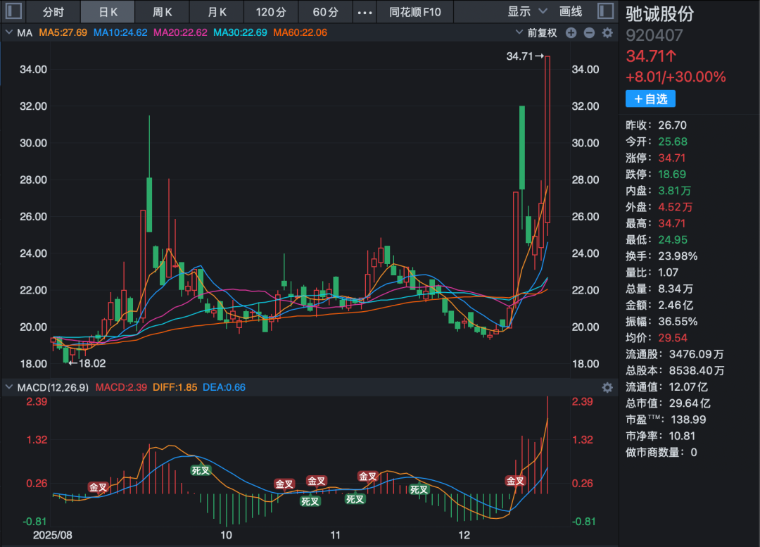 驰诚股份(920407)18日录得“30cm”涨停,最新报34.71元/股,总市值29.64亿元。