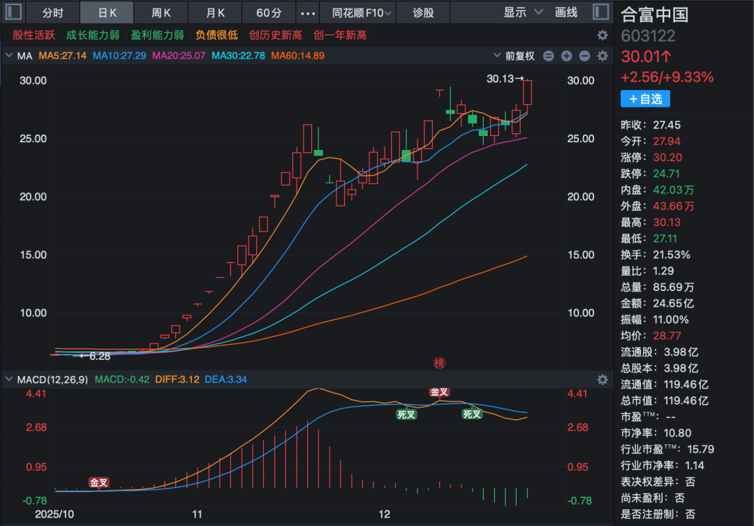 合富中国(603122)收盘上涨9.33%,最新收盘价报收30.01元/股,创下历史新高,年内累计涨幅达到336.18%,最新A股市值逼近120亿元。