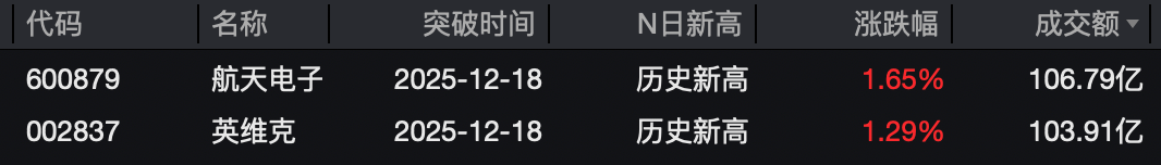 航天电子(600879)、英雄克(002837)收盘股价创历史新高,当天成交额均超过100亿元。