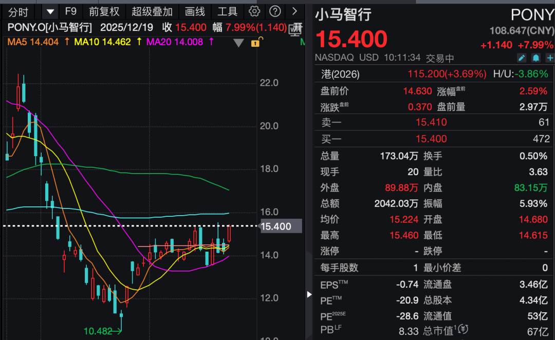 小马智行涨近8%。近日,在媒体沟通会上,小马智行联合创始人、CFO王皓俊表示,目前广州地区的Robotaxi日均订单已达到23单/辆,日均营收达到299元/辆(已扣除折扣和退款),这一水平支撑广州车队在11月实现了单车营收平衡,构建起一个可验证的单车盈利模型。