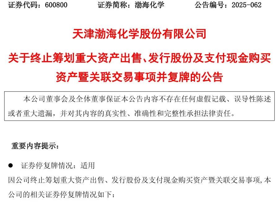 渤海化学(600800)12月19日晚间宣布,终止筹划重大资产出售、发行股份及支付现金购买资产暨关联交易事项。