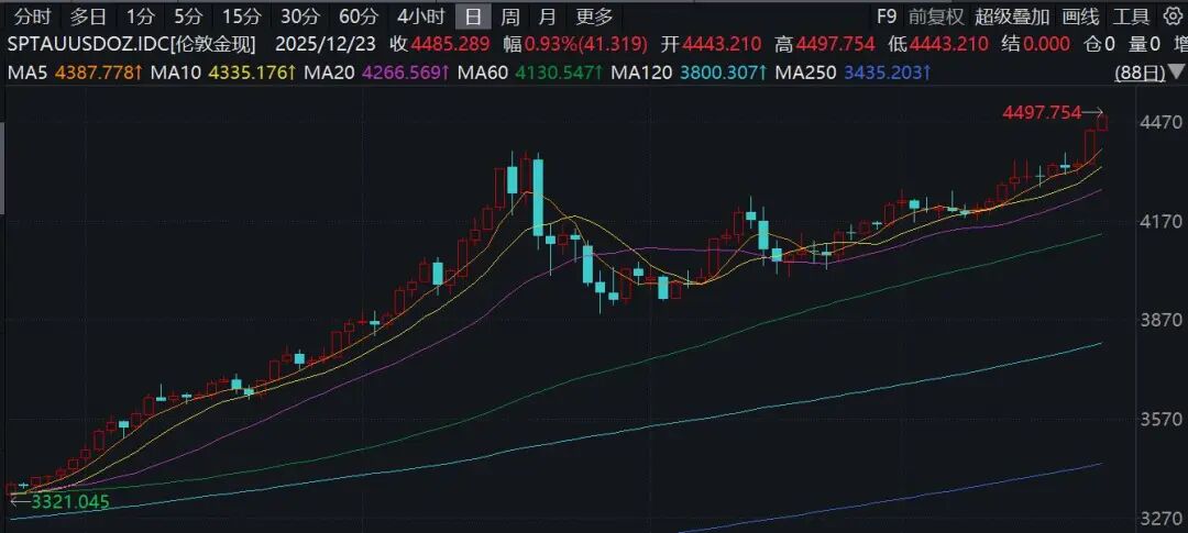 12月23日盘中,伦敦现货黄金一度接近每盎司4498美元,突破10月底每盎司4381美元的高点。受此影响,上海黄金交易所现货黄金价格23日盘中触及每克1014元,上海期货交易所上市的黄金期货主力合约一度涨至每克1018元,均创新高。