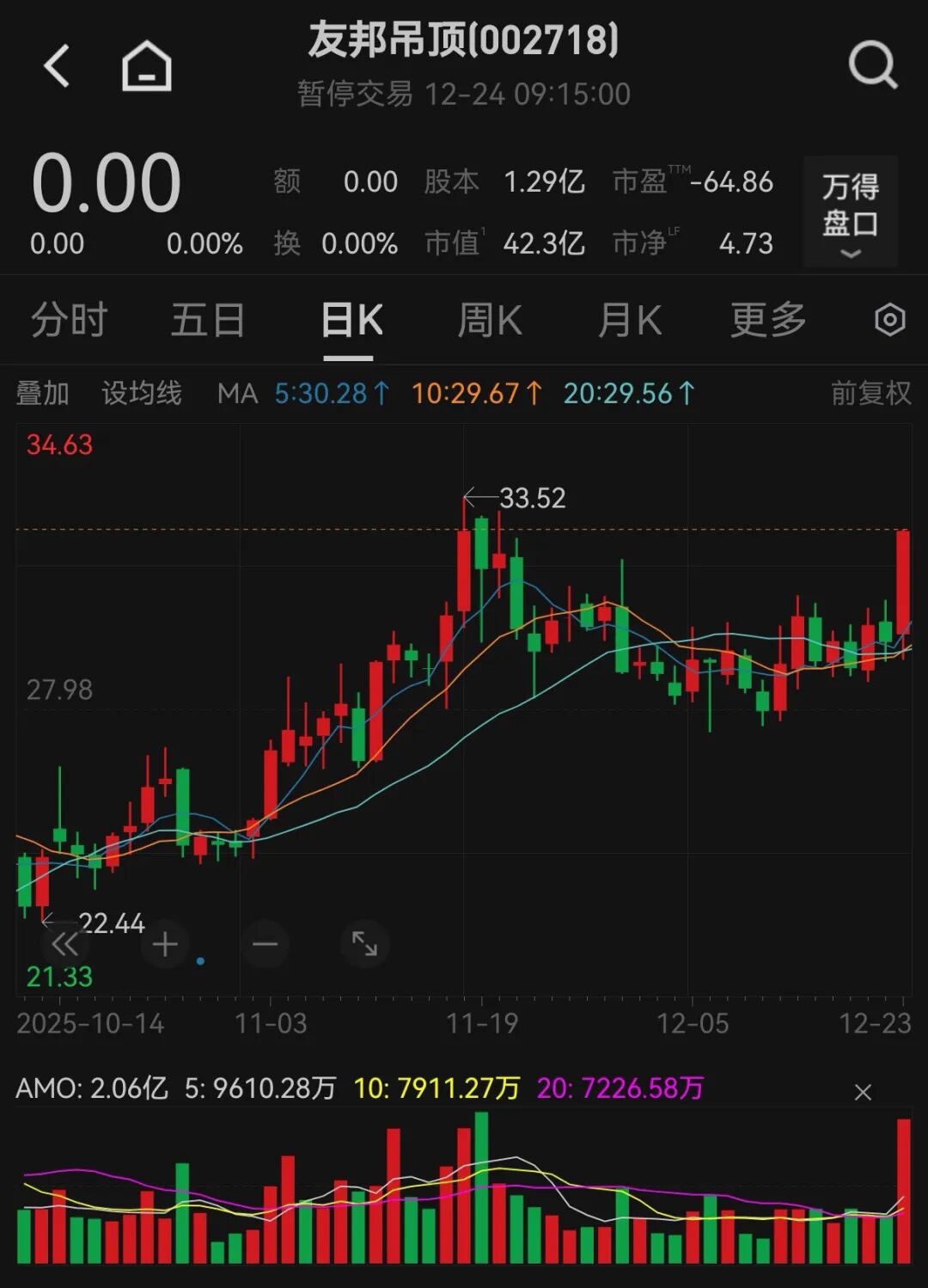 另外,友邦吊顶(002718)12月24日早间披露公告称,公司筹划控制权变更事项,经公司申请,公司股票于12月24日起临时停牌。此前,友邦吊顶股价于12月23日涨停收盘。截至当日收盘,公司报涨停价32.67元/股,总市值42.29亿元。