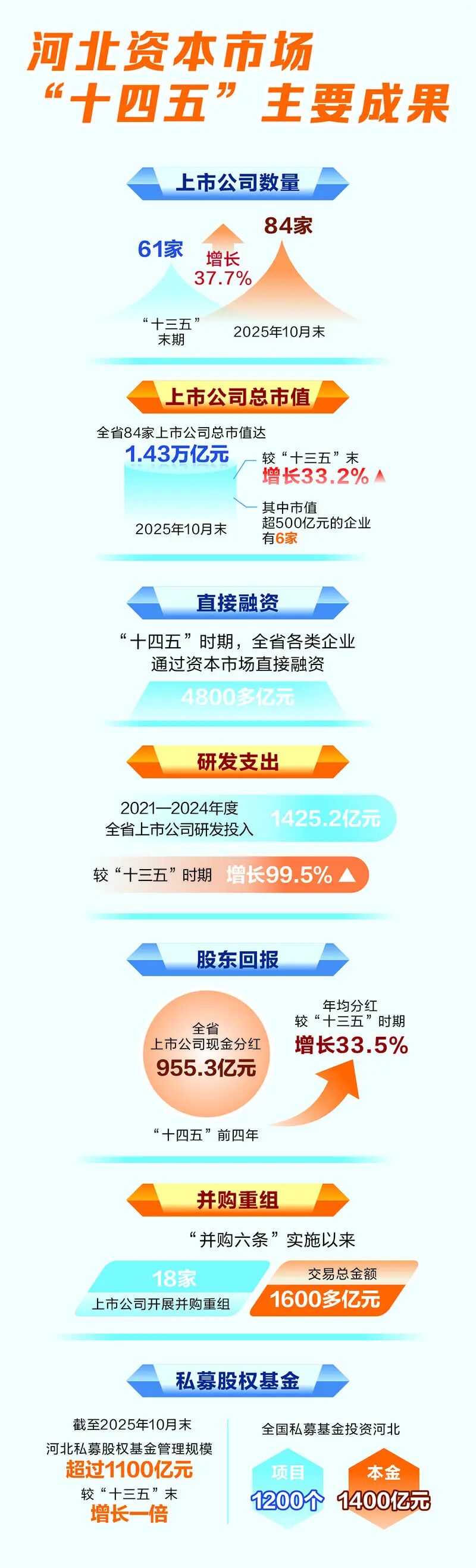 证券时报记者从河北证监局获悉,“十四五”时期(截至2025年10月末),河北新增境内上市公司24家,各类企业通过资本市场直接融资超4800亿元,私募基金管理规模翻倍增长,多层次资本市场体系愈发健全,为河北现代化产业体系建设注入强劲资本动能。展望“十五五”,河北资本市场正锚定新质生产力发展方向,持续深化改革创新,续写资本与产业深度融合的崭新篇章。