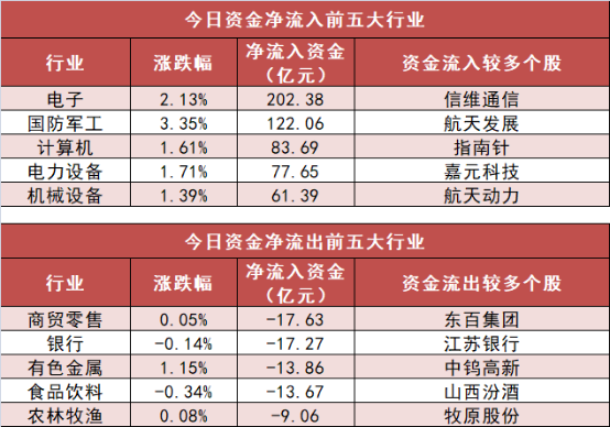 申万一级行业中,23个行业实现资金净流入,其中电子行业净流入202.38亿元居首。