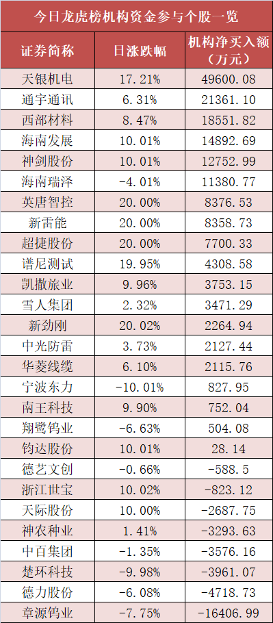盘后龙虎榜数据显示,机构现身多股,其中天银机电等股票呈现机构资金净买入,章源钨业等股票呈现机构资金净卖出。