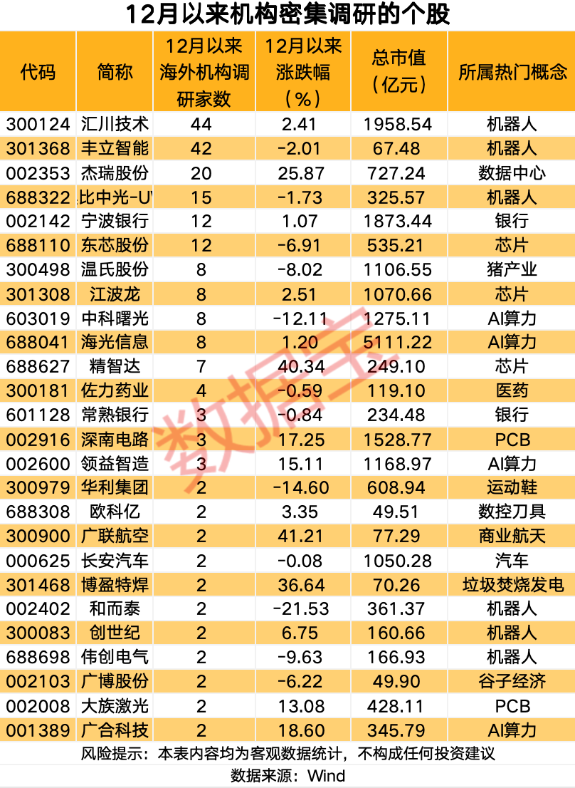 根据调研日期截止日统计,12月以来,共有69股获得海外机构调研,其中获5家及以上海外机构调研的共有11股,汇川技术、丰立智能、杰瑞股份海外机构调研家数最多,分别达到44家、42家、20家,其中汇川技术、丰立智能均具有机器人概念。