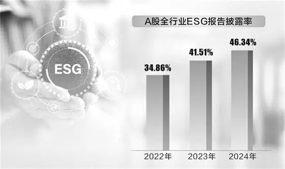 有数据显示,2022年,A股全行业ESG报告披露率为34.86%;2023年,全行业披露率提升至41.51%;2024年,全行业披露率为46.34%。中证800指数成份股的ESG报告披露呈现稳步提升趋势。2022年至2024年,披露率从82.25%上升至89.25%。