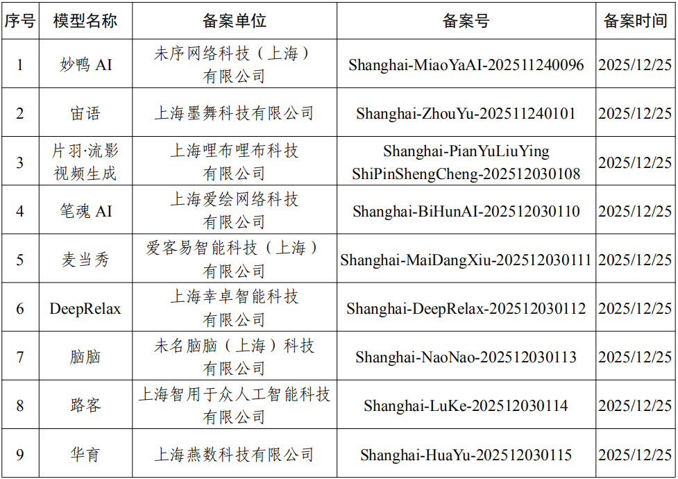截至12月25日上海市新增9款已完成备案的生成式人工智能服务