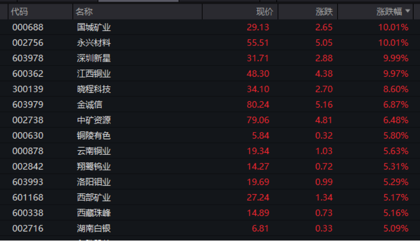 行业板块和赛道方面,若按照申万一级行业划分,有色金属板块大涨,板块盘中涨幅超过3%,板块内个股掀起涨停潮。永兴材料、国城矿业、江西铜业、深圳新星等股票涨停,晓程科技、铜陵有色、中矿资源等股票涨幅居前。