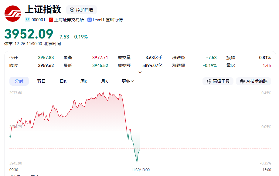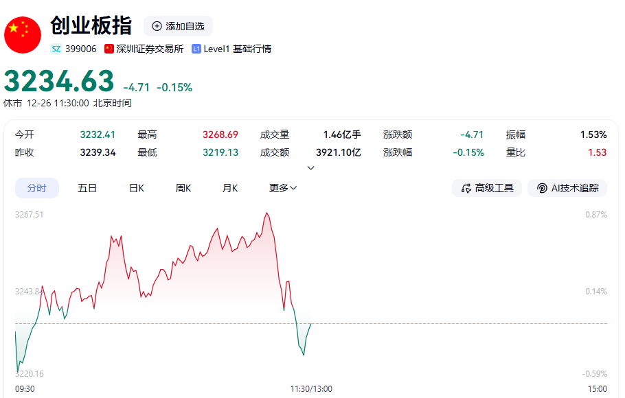 A股市场今天(12月26日)早盘震荡走强,临近午盘(11:13),主要股指小幅跳水,上证指数、创业板指等翻绿。