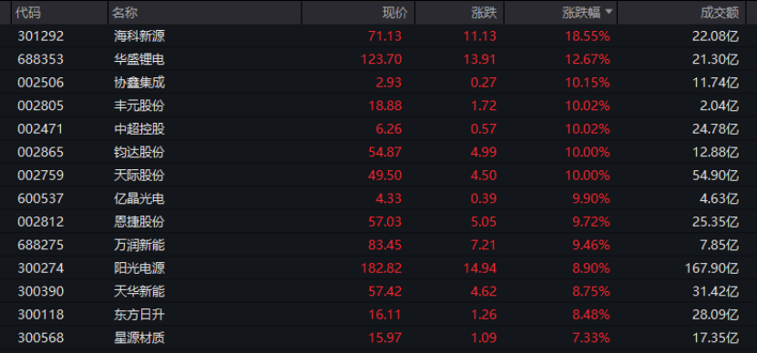 电力设备板块也掀起涨停潮。海科新源一度20%涨停,协鑫集成、中超控股、丰元股份、天际股份等多股涨停。