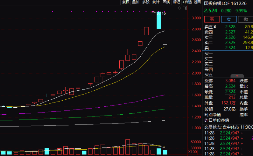 国投白银LOF(161226)今日10:30复牌即跌停,截至上午收盘,仍牢牢封住跌停,这是国投白银LOF连续第二个交易日盘中跌停。
