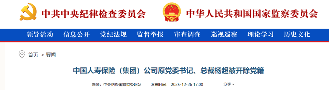 据中央纪委国家监委驻中国人寿纪检监察组、江西省纪委监委消息,日前,中央纪委国家监委驻中国人寿纪检监察组、江西省上饶市监委对中国人寿保险(集团)公司原党委书记、总裁杨超严重违纪违法问题进行了纪律审查和监察调查。
