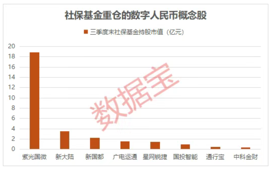 部分数字人民币概念股备受机构资金青睐,统计显示,截至三季度末,共有8只概念股获社保基金或养老金重仓持股,合计持股市值达到29.39亿元,其中紫光国微、新国都、星网锐捷、中科金财为新进重仓,新大陆、国投智能持股数量环比实现增长。