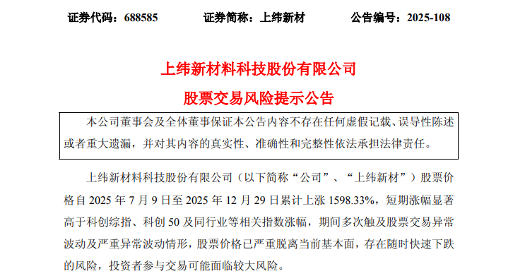 29日晚间上纬新材披露股票交易风险提示公告显示,公司股票价格自2025年7月9日至2025年12月29日累计上涨1598.33%,短期涨幅显著高于科创综指、科创50及同行业等相关指数涨幅,其间多次触及股票交易异常波动及严重异常波动情形,股票价格已严重脱离当前基本面,存在随时快速下跌的风险,投资者参与交易可能面临较大风险。