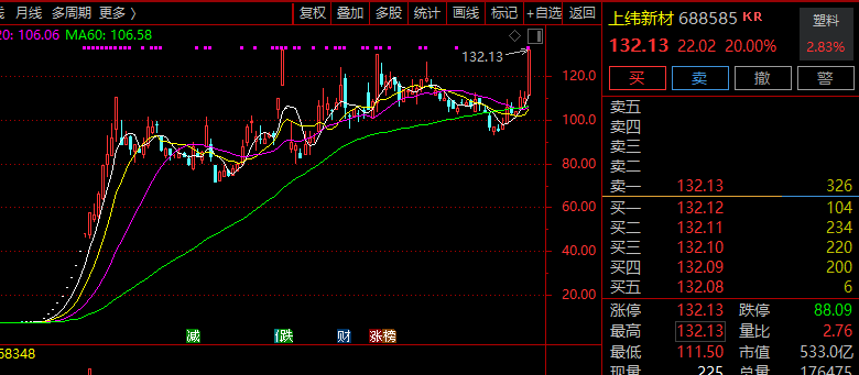 12月29日,上纬新材(688585)股价大幅上行,午后该公司股价冲抵涨停,涨幅20%,报收132.13元/股,创历史新高。