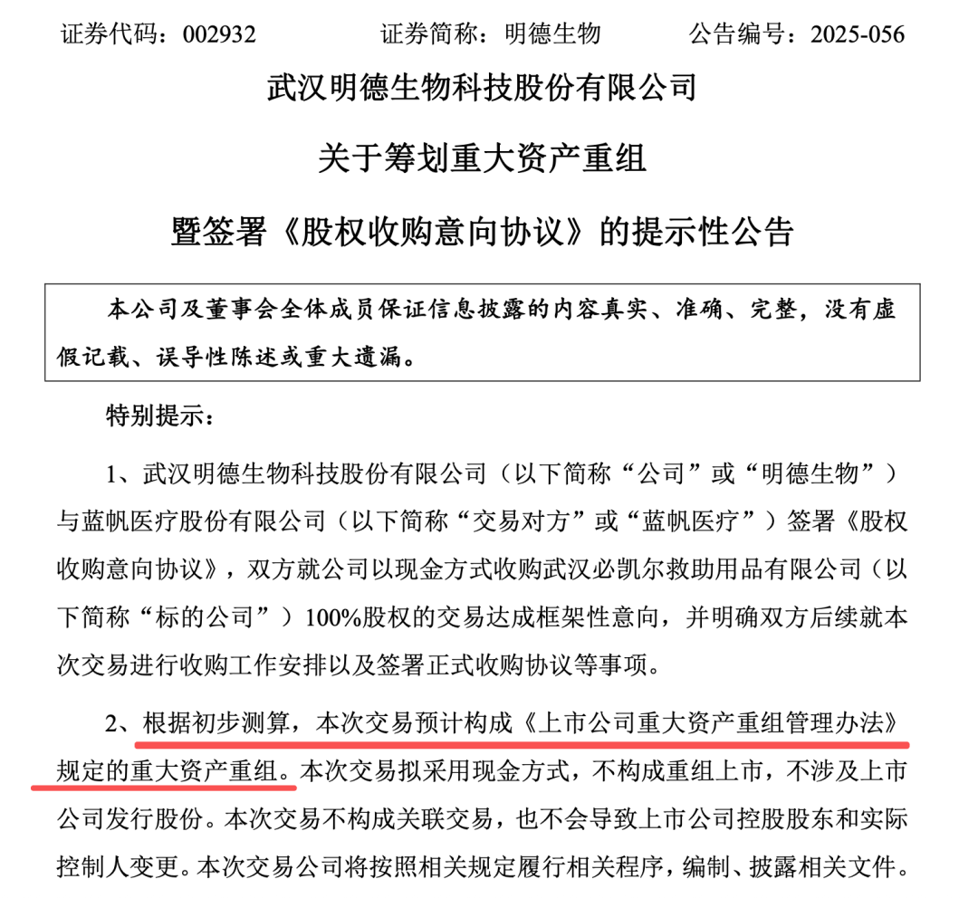 明德生物表示,根据初步测算,本次交易预计构成《上市公司重大资产重组管理办法》规定的重大资产重组。本次交易拟采用现金方式,不构成重组上市,不涉及上市公司发行股份。