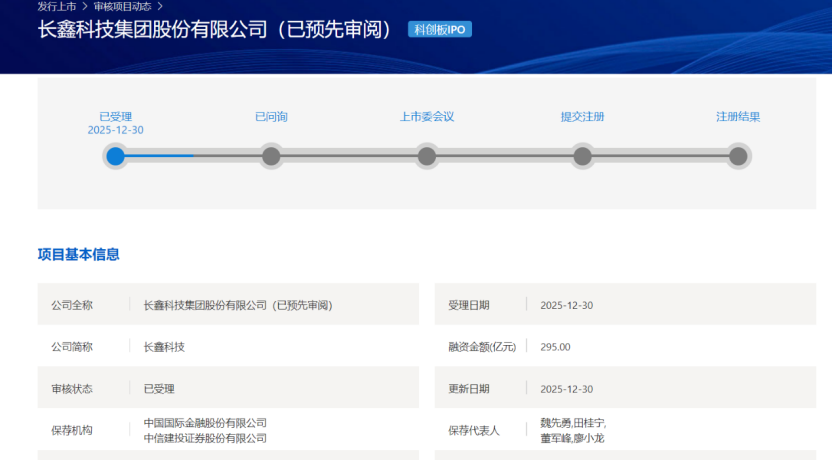 12月30日,上交所官网显示,长鑫科技集团股份有限公司(以下简称“长鑫科技”)科创板IPO申请获受理。此前,该IPO申请已预先审阅,并在受理当天披露了两轮预先审阅问询函的回复。这是科创板首单获受理的预先审阅IPO项目。