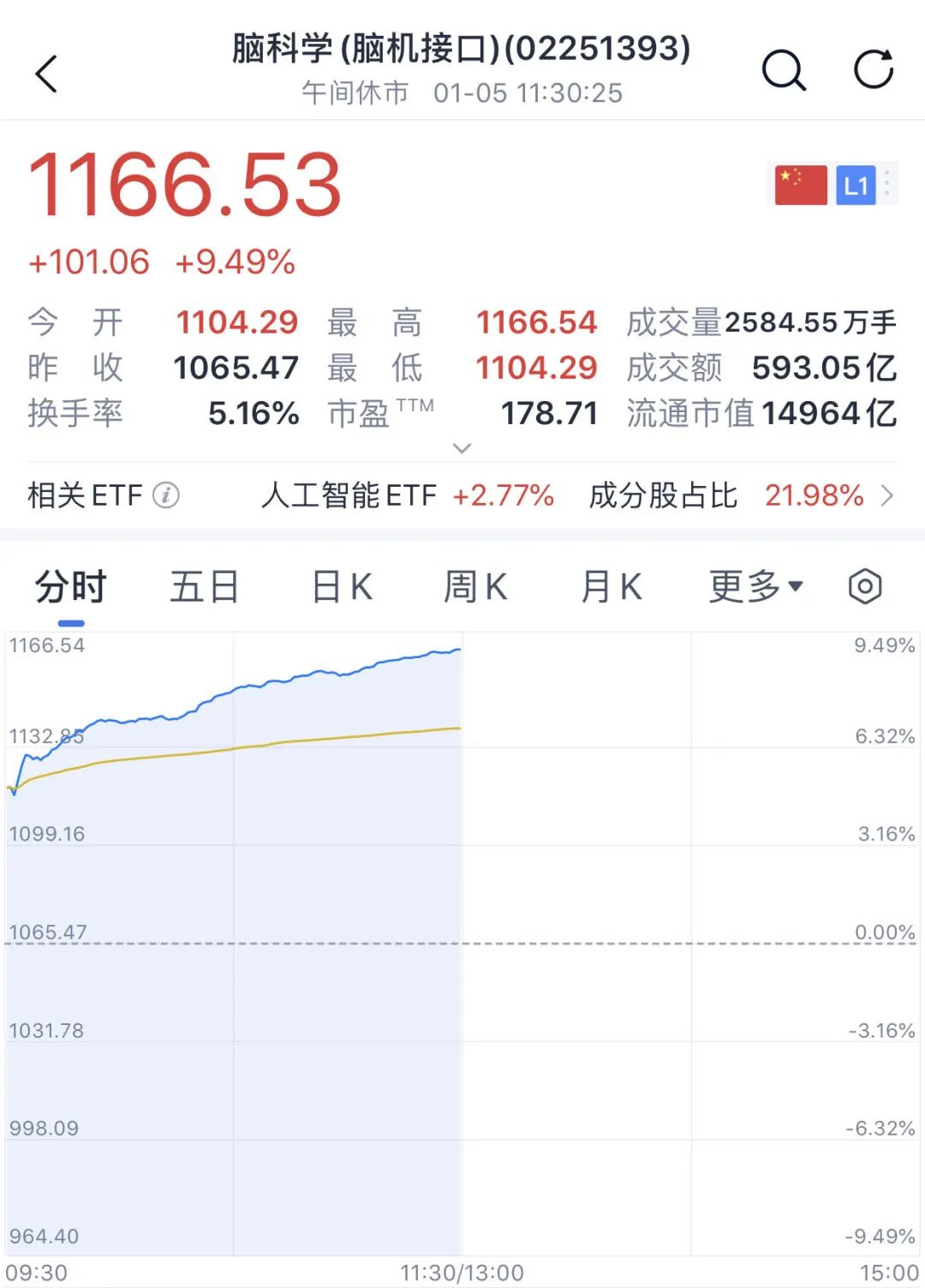 值得注意的是,受到相关消息提振,上午A股市场和港股市场的脑机接口概念股集体暴涨,相关个股掀涨停潮。