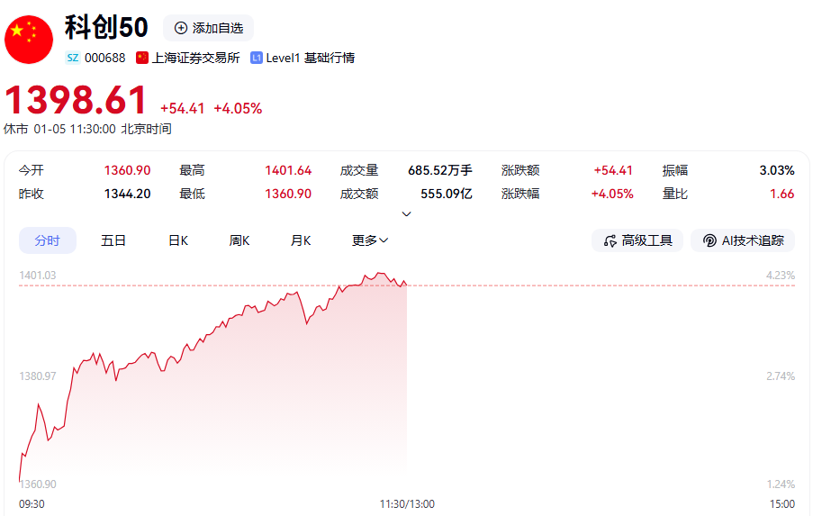 公历2026年首个交易日(1月5日)上午,A股市场强劲上行,其中上证指数向上突破4000点整数大关。