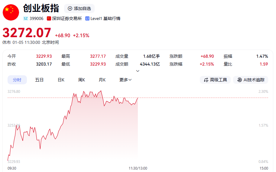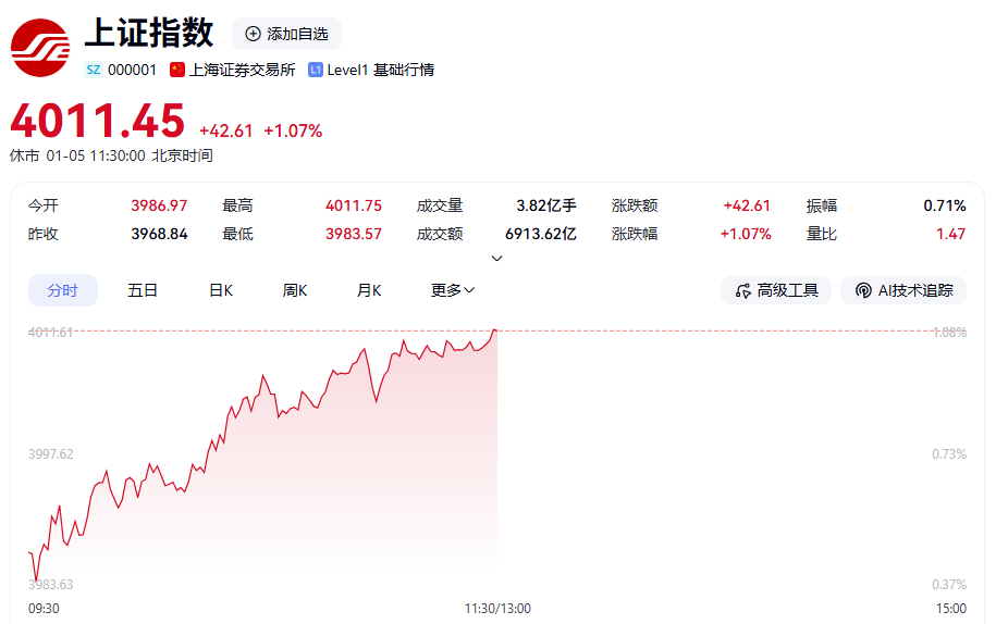 公历2026年首个交易日上午,A股市场强劲上行,主要指数不同程度上涨,截至中午收盘,上证指数涨超1%,报4011.45点,再次站上4000点整数大关;深证成指涨近2%。