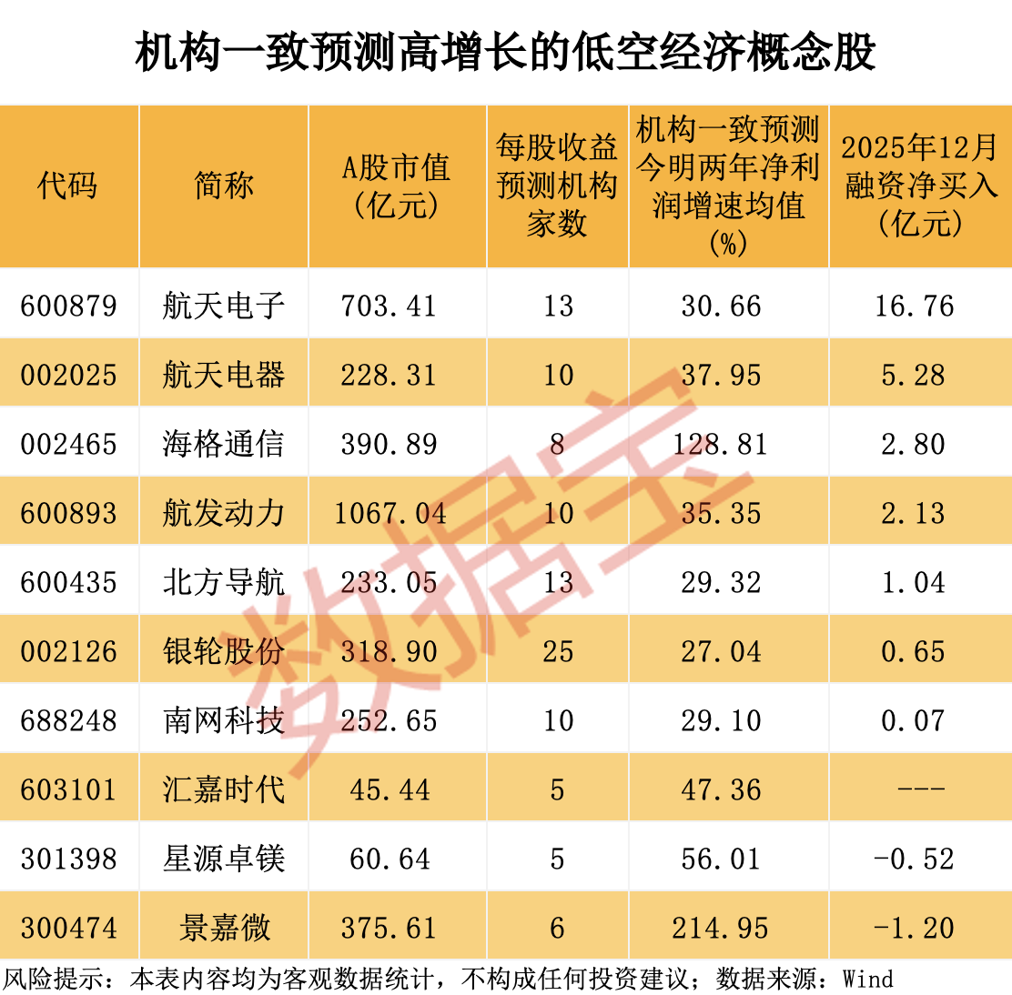 据数据宝统计,从未来增长潜力来看,根据5家及以上机构一致预测,2026年、2027年净利润增速均有望超20%的低空经济概念股有10只。这10股当中,2025年12月融资净买入均逾1亿元的有5股,分别是航天电子、航天电器、海格通信、航发动力、北方导航。