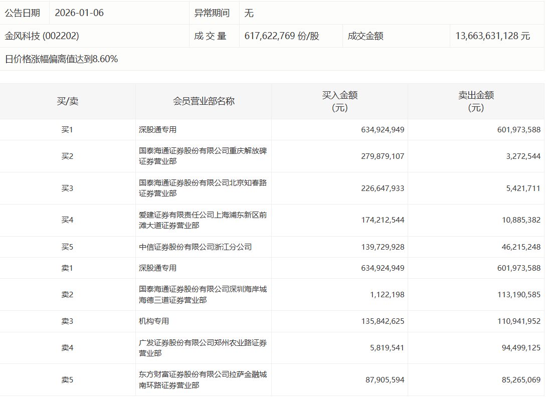 人民财讯1月6日电,金风科技今日涨停,成交额136.64亿元,盘后龙虎榜数据显示,深股通专用席位买入6.35亿元并卖出6.02亿元,1家机构专用席位净买入2490.07万元。