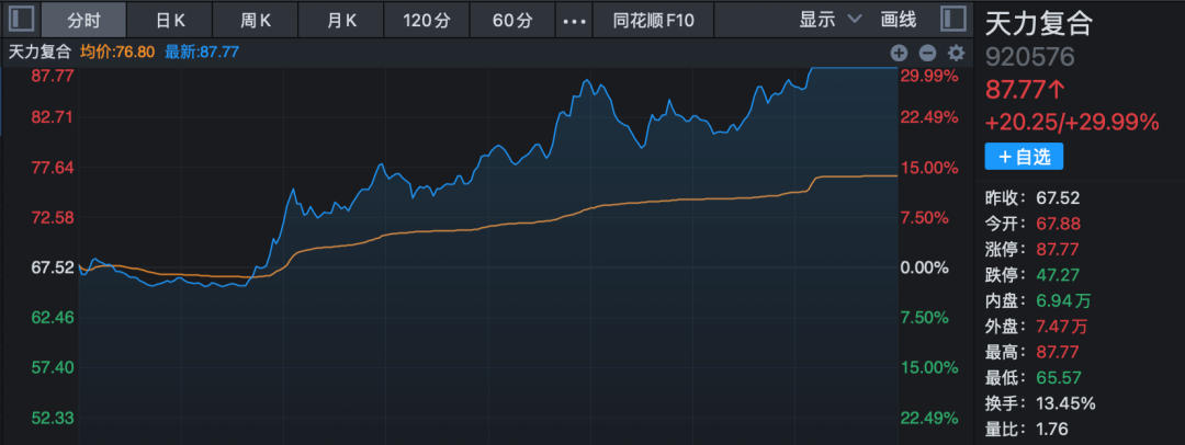 航天装备概念股午后再度拉升,板块指数飙升8.55%,创历史新高。自去年12月以来,短短1个月时间该指数累计上涨超100%。天力复合临近收盘30%涨停,联建光电、航天环宇、航天电子、中国卫通等午后均强势涨停。