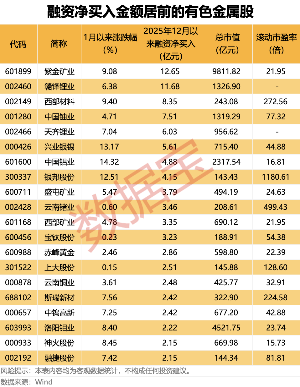 资金面上来看,2025年12月以来,有色金属行业获融资净买入达到109.7亿元,净流入金额在全行业中排名第四,紫金矿业、赣锋锂业、西部材料、中国铀业、天齐锂业、兴业银锡融资净买入金额均超过5亿元。