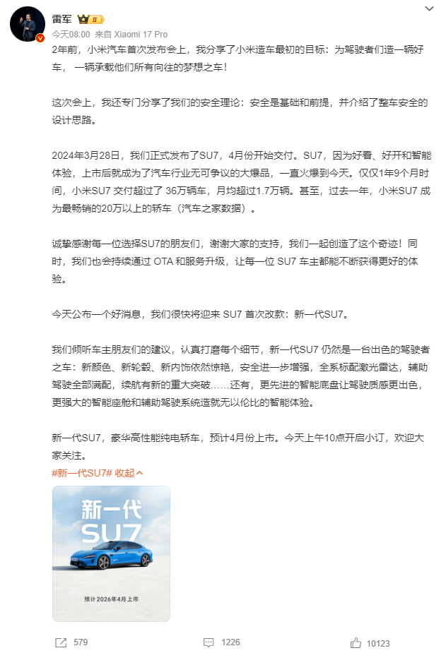 雷军官宣!新一代SU7预计4月份上市,续航有新的重大突破!