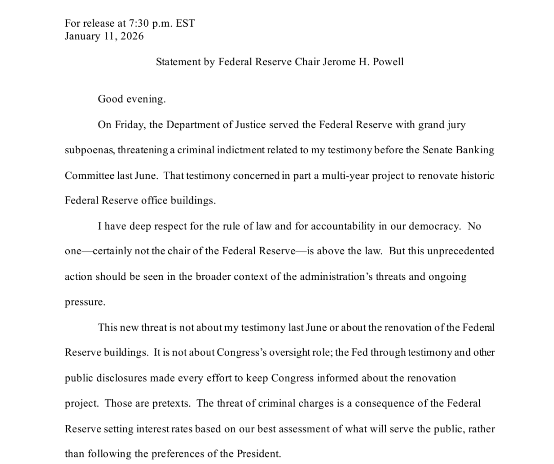 鲍威尔在声明中披露,1月9日(周五),美国司法部向美联储送达大陪审团传票,以其2025年6月在参议院银行委员会的证词为由威胁发起刑事起诉。该证词部分涉及美联储一项为期多年的历史性办公楼翻新项目。