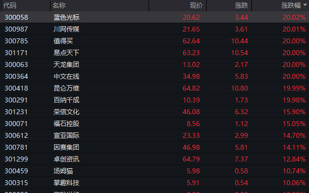 传媒板块其他个股中,川网传媒、天龙集团、易点天下、中文在线、值得买、百纳千成等多股盘中“20cm”涨停,另有多股涨停或涨幅超过10%。