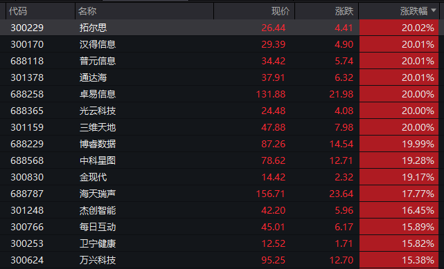 计算机板块亦掀起涨停潮,整个板块盘中逾40股涨停或盘中涨幅超过10%,其中拓尔思、通达海、普元信息、光云科技、三维天地、卓易信息、博睿数据等多股“20cm”涨停。
