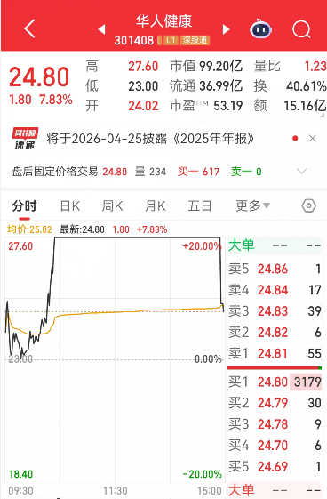 尾盘30分钟内,多只热门题材股出现跳水情况。AI医疗概念股华人健康(301408)在14:55左右大幅走低,涨幅由20%回落至收盘的7.83%,短短5分钟内回撤幅度达到10%以上;阿里概念股东百集团盘中一度涨超5%,尾盘阶段股价大跌,收盘时触及跌停板,全天最大回撤幅度接近15%。