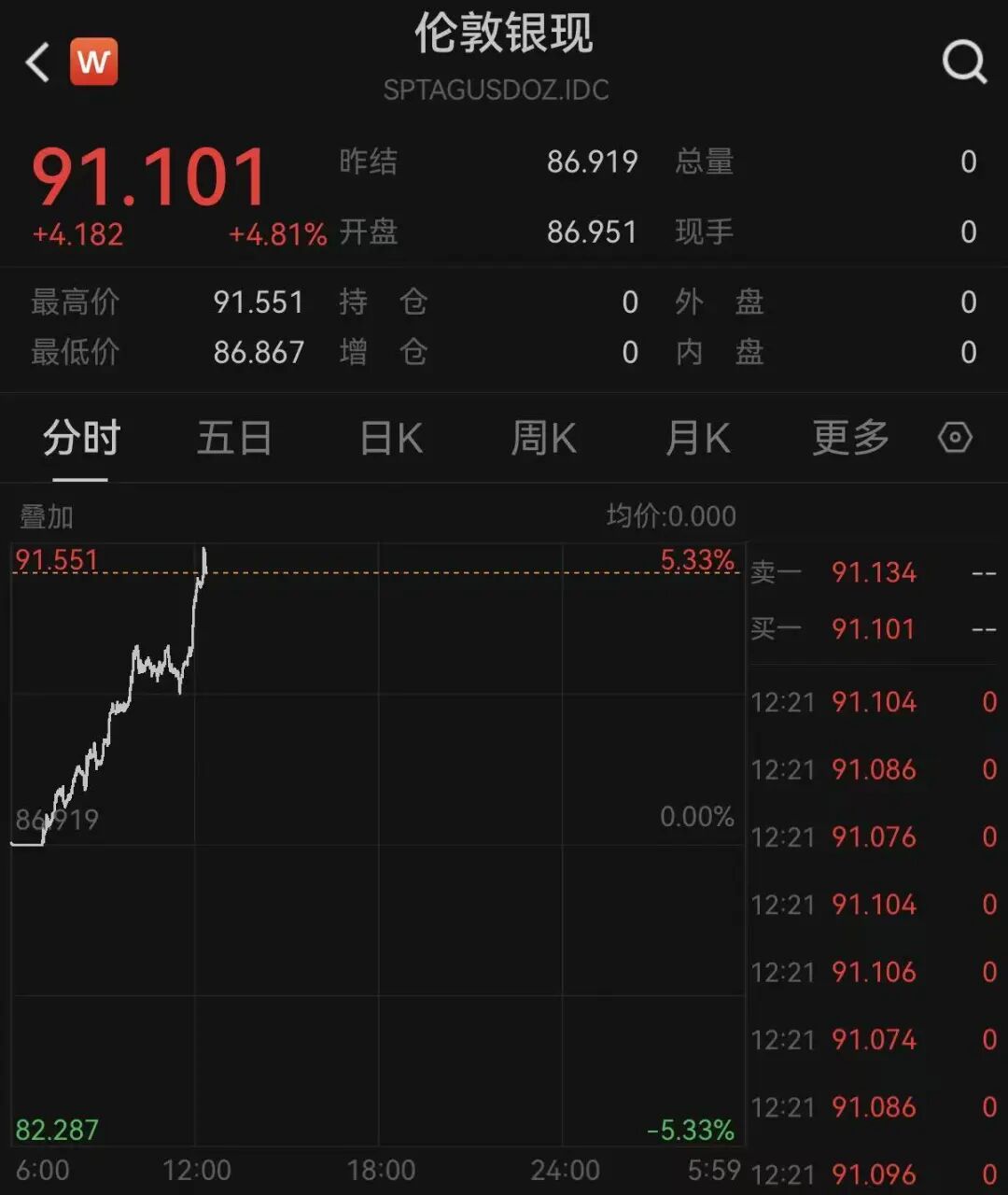 截至发稿,现货黄金涨超0.9%,现货白银涨超4.8%,站上91美元,再创历史新高。
