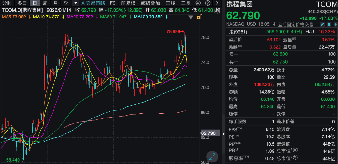 热门中概股多数下跌,纳斯达克中国金龙指数跌0.23%,携程跌超17%,拼多多跌近4%,理想汽车、蔚来、小鹏汽车、霸王茶姬跌超2%,哔哩哔哩涨超6%。