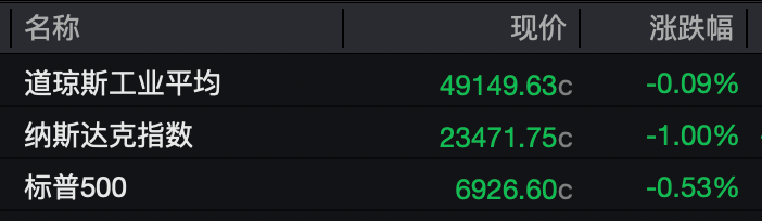 昨夜,美股三大指数集体收跌,道指跌0.09%,纳指跌1.00%,标普500指数跌0.53%。