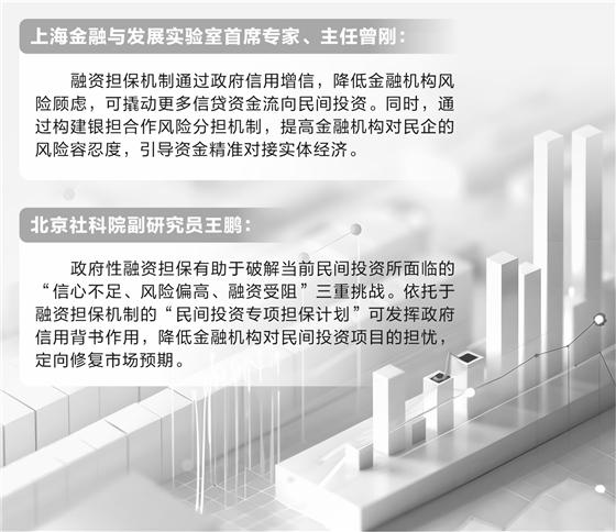 政府性融资担保为小微企业增进信用,为金融机构分担风险,是财政金融政策协调配合支持小微企业融资发展、促进就业、扩大内需的重要政策工具。北京社科院副研究员王鹏向证券时报记者指出,政府性融资担保有助于破解当前民间投资所面临的“信心不足、风险偏高、融资受阻”三重挑战。依托于融资担保机制的“民间投资专项担保计划”可发挥政府信用背书作用,降低金融机构对民间投资项目的担忧,定向修复市场预期。