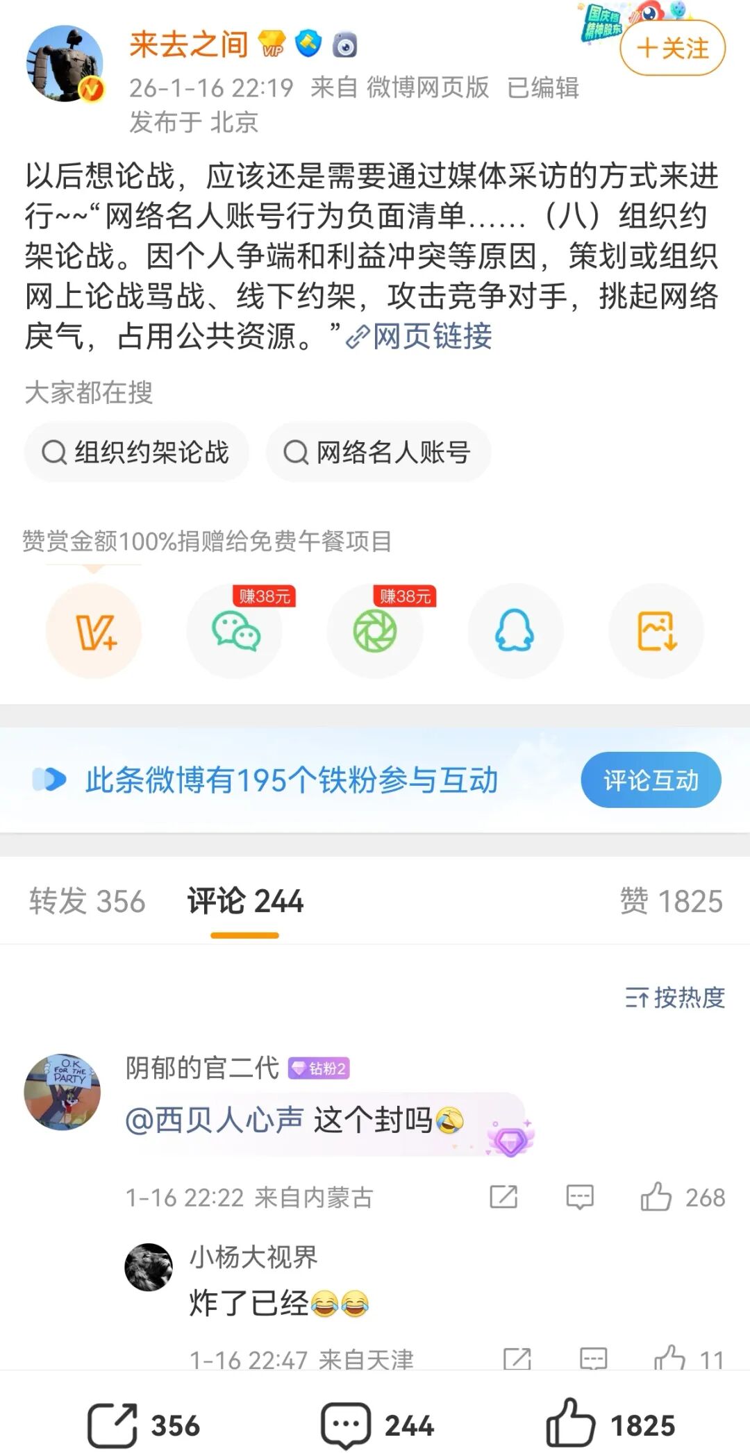 新浪微博首席执行官王高飞“来去之间”发文称,“以后想论战,应该还是需要通过媒体采访的方式来进行~~‘网络名人账号行为负面清单……(八)组织约架论战。因个人争端和利益冲突等原因,策划或组织网上论战骂战、线下约架,攻击竞争对手,挑起网络戾气,占用公共资源。’”