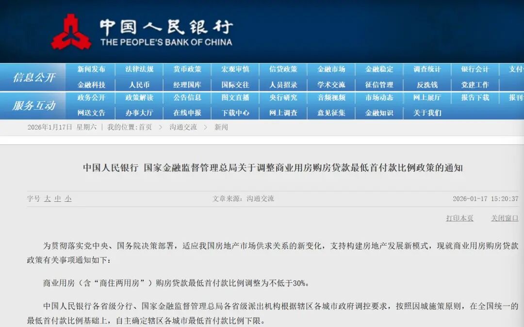 1月17日,中国人民银行、国家金融监督管理总局发布关于调整商业用房购房贷款最低首付款比例政策的通知。为贯彻落实党中央、国务院决策部署,适应我国房地产市场供求关系的新变化,支持构建房地产发展新模式,现就商业用房购房贷款政策有关事项通知如下:商业用房(含“商住两用房”)购房贷款最低首付款比例调整为不低于30%。中国人民银行各省级分行、国家金融监督管理总局各省级派出机构根据辖区各城市政府调控要求,按照因城施策原则,在全国统一的最低首付款比例基础上,自主确定辖区各城市最低首付款比例下限。