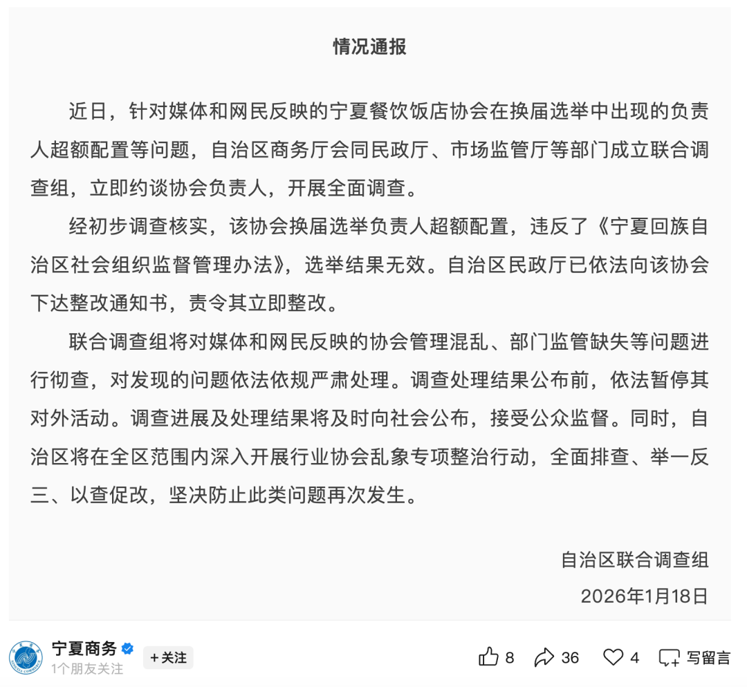 针对媒体和网民反映的宁夏餐饮饭店协会在换届选举中出现的负责人超额配置等问题,自治区商务厅会同民政厅、市场监管厅等部门成立联合调查组,立即约谈协会负责人,开展全面调查。