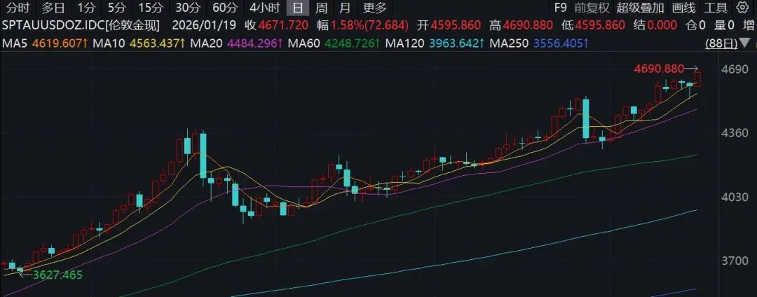 特朗普对欧洲的关税威胁引发避险需求,黄金和白银价格双双触及历史新高。现货黄金一度上涨2%,触及4690美元/盎司。现货白银涨超5%,达到94.7美元/盎司。