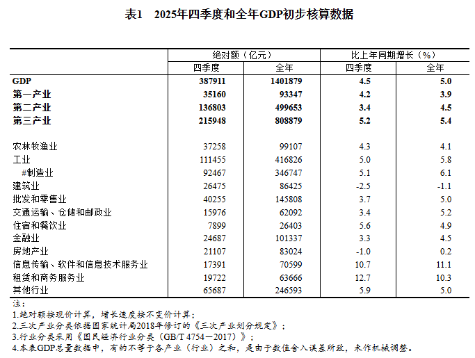国家统计局发布2025年四季度和全年国内生产总值初步核算结果